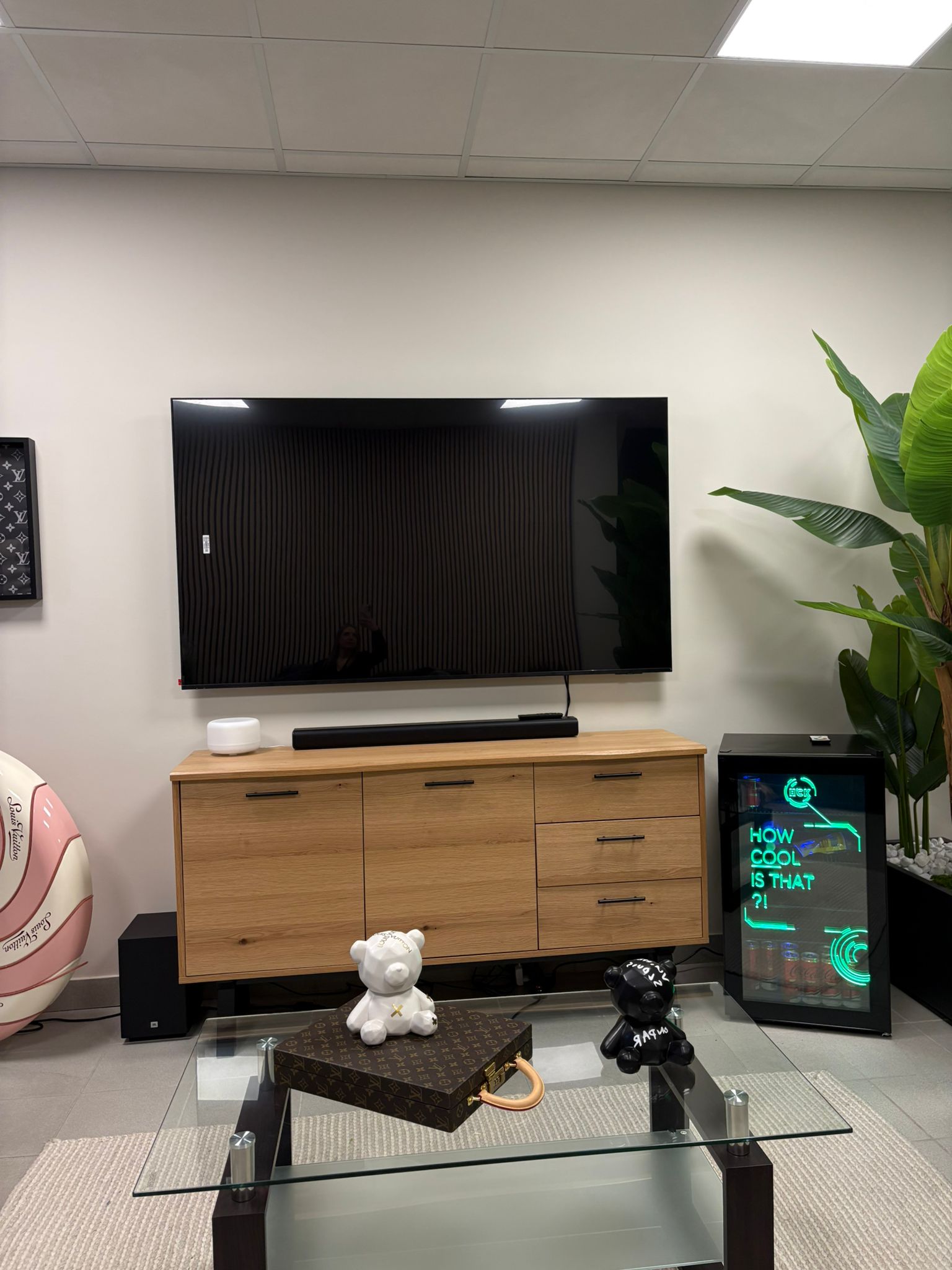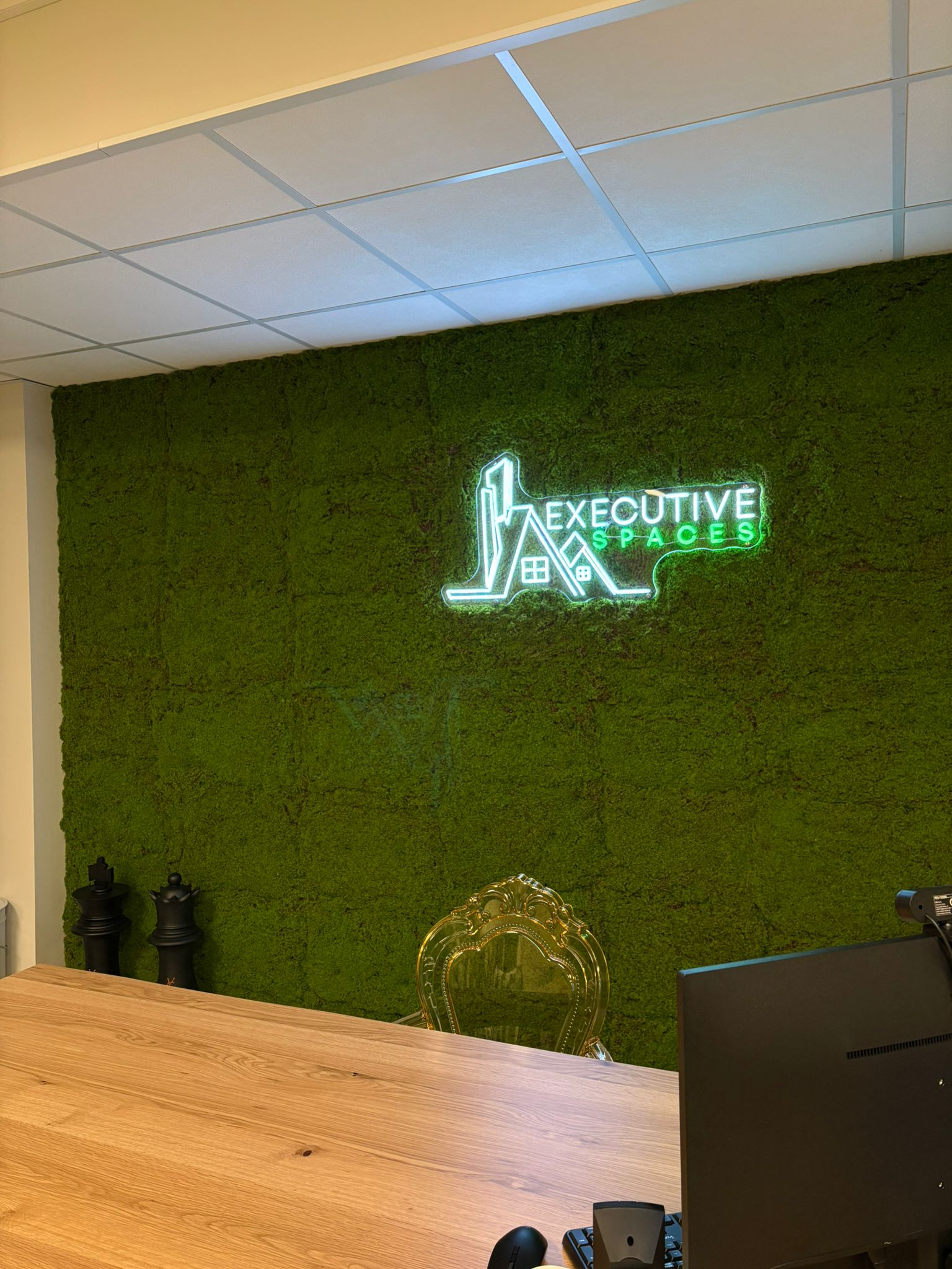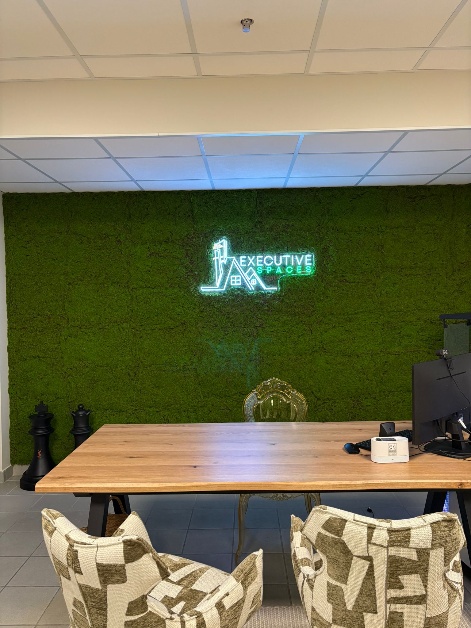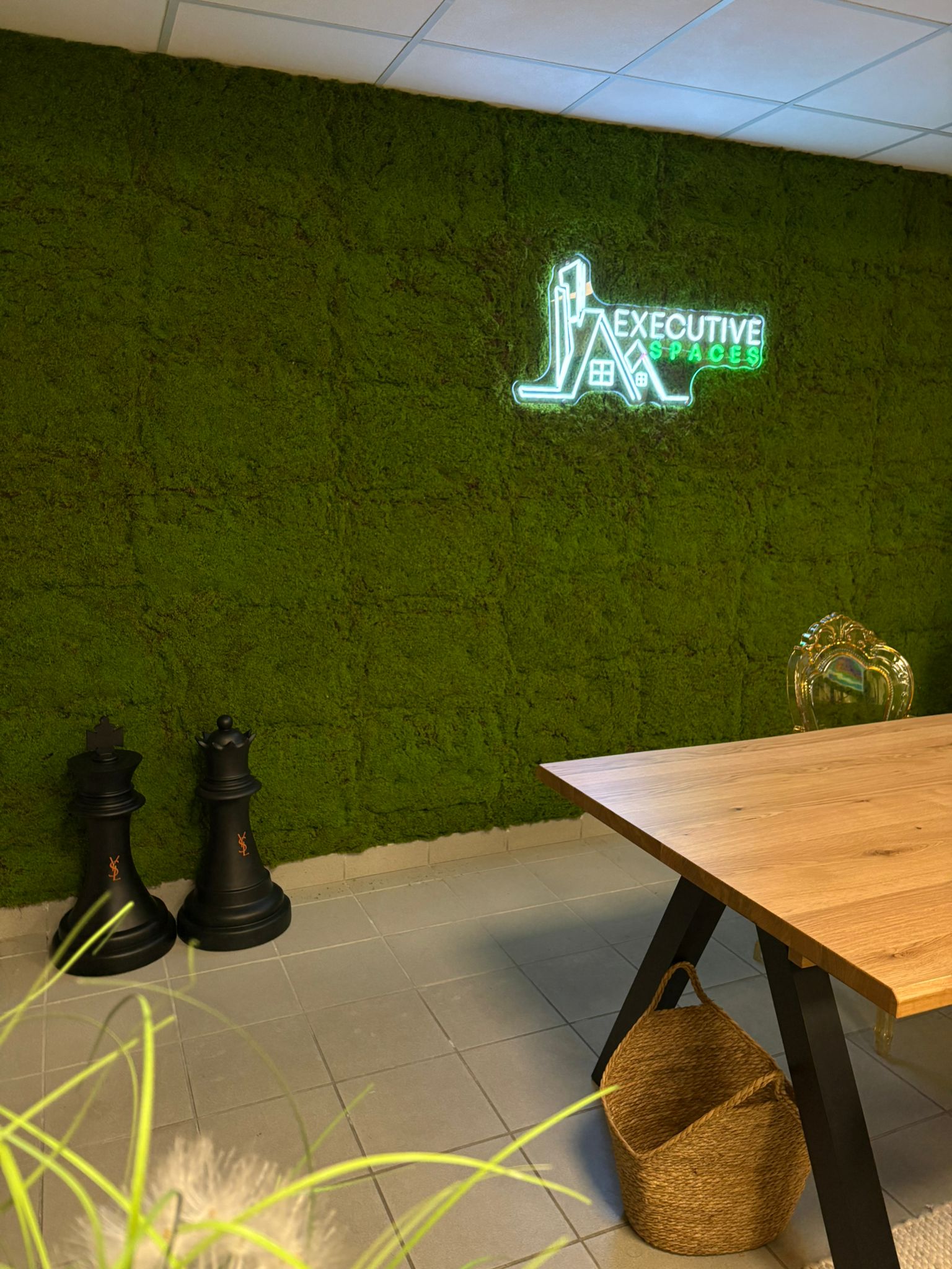 Al centro, il logo luminoso “Executive Spaces” funge da firma visiva: elegante, moderno e perfettamente integrato nel verde, rafforza il branding e rende l’ambiente immediatamente riconoscibile e memorabile per clienti e partner.