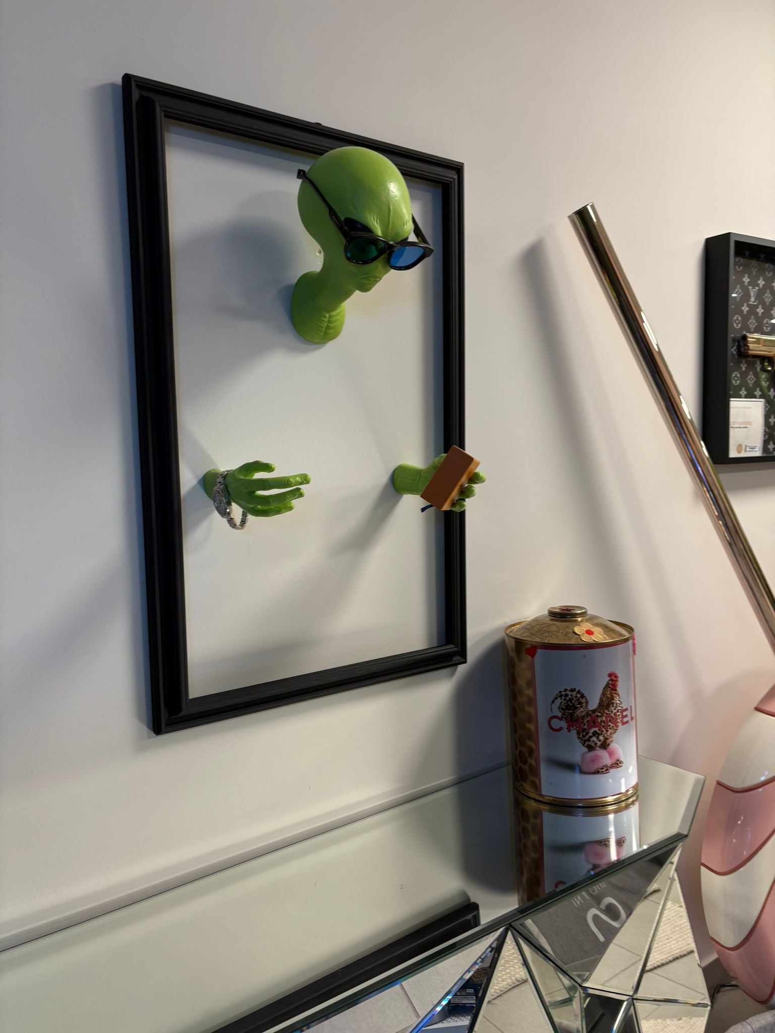 Gli elementi decorativi oversize, come i pezzi degli scacchi, introducono un messaggio simbolico di strategia, visione e leadership, mentre i dettagli lifestyle (cesti intrecciati, materiali naturali) rendono lo spazio più caldo e accogliente. Il camino in vetro e la parete espositiva con oggetti di design elevano ulteriormente la percezione di lusso discreto.